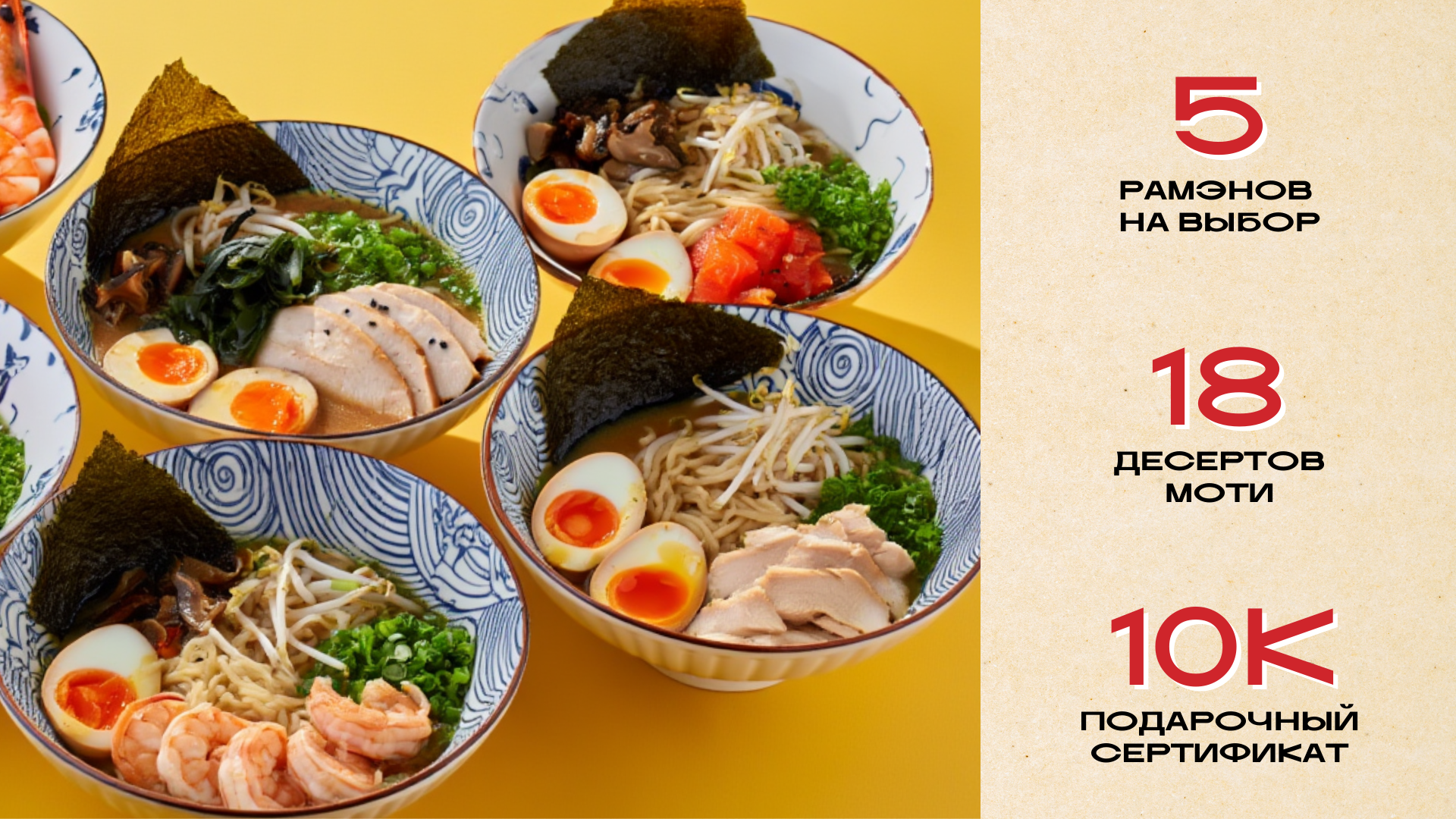 Любой праздник – это подарки. При заказе до 30 декабря: 🍜 От 20 000 ₽ дарим 5 рамэнов на ваш выбор по промокоду GIFT20 🍡 От 35 000 ₽ дарим 18 фирменных моти по промокоду GIFT35 🎁 От 50 000 ₽ дарим сертификат на 10 000 ₽ по промокоду GIFT50